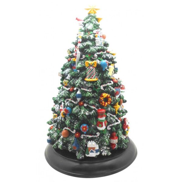 Albero di Natale con luci LED. L’albero di Natale molto decorato si erge su una base di colore marrone scuro. Premendo l’interruttore, le luci LED colorate si accendono, l’albero gira sulla base e suonano 8 melodie. Funzionante con batterie 3xAA (non incluse). Misure : 32,5 x 21,5 x 21,5 cm.