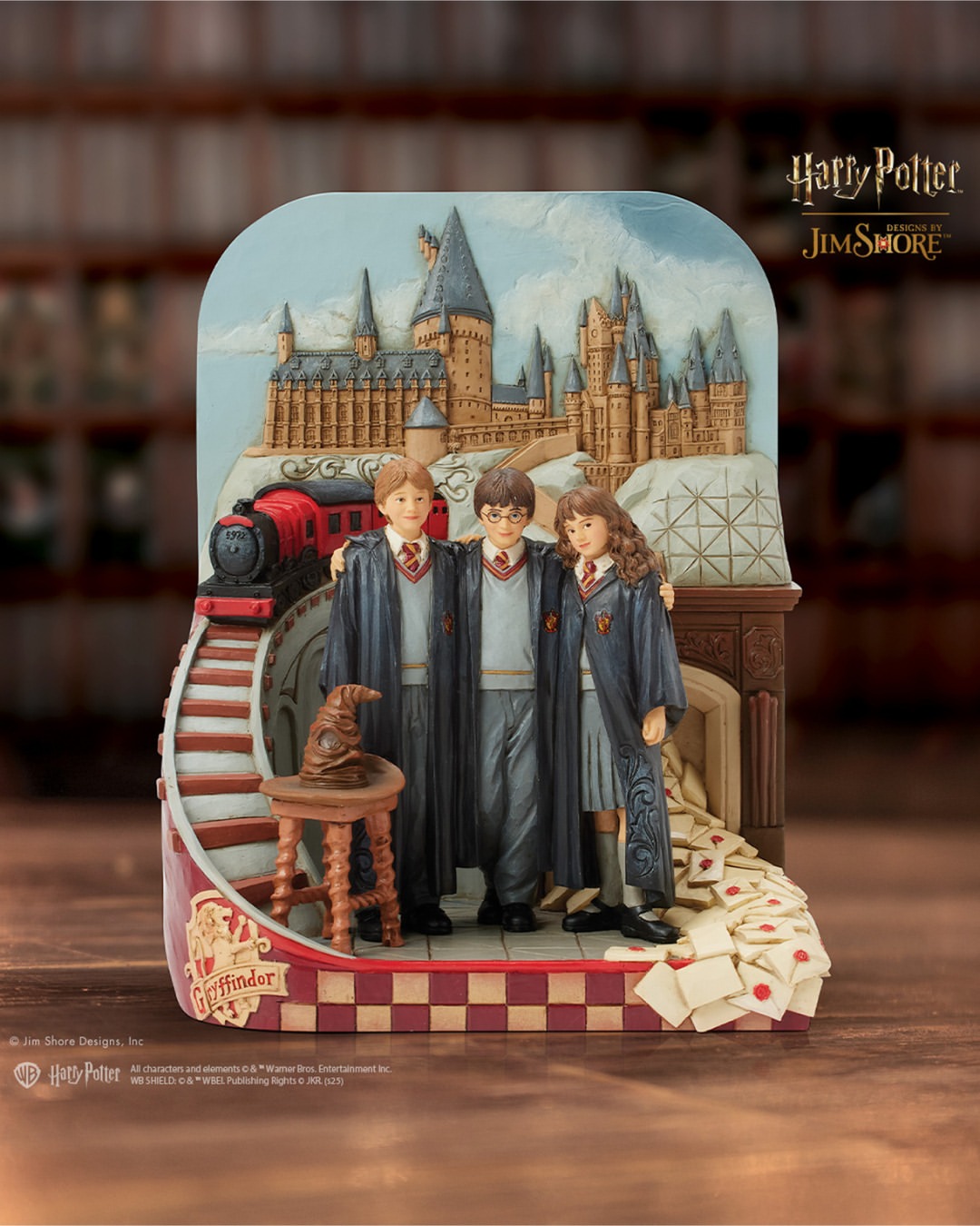 Questa incantevole scena di Jim Shore riporta in vita la magia di Hogwarts, con Harry, Ron e Hermione in piedi, nei loro abiti di Grifondoro, fuori dall’iconico castello. Il design include l’Espresso per Hogwarts, lettere volanti e il Cappello Parlante.