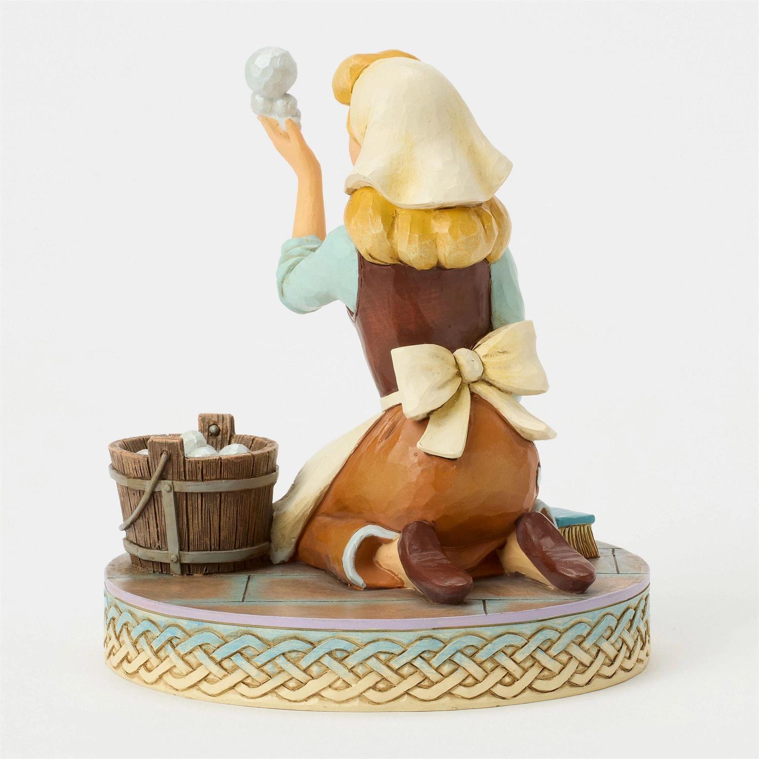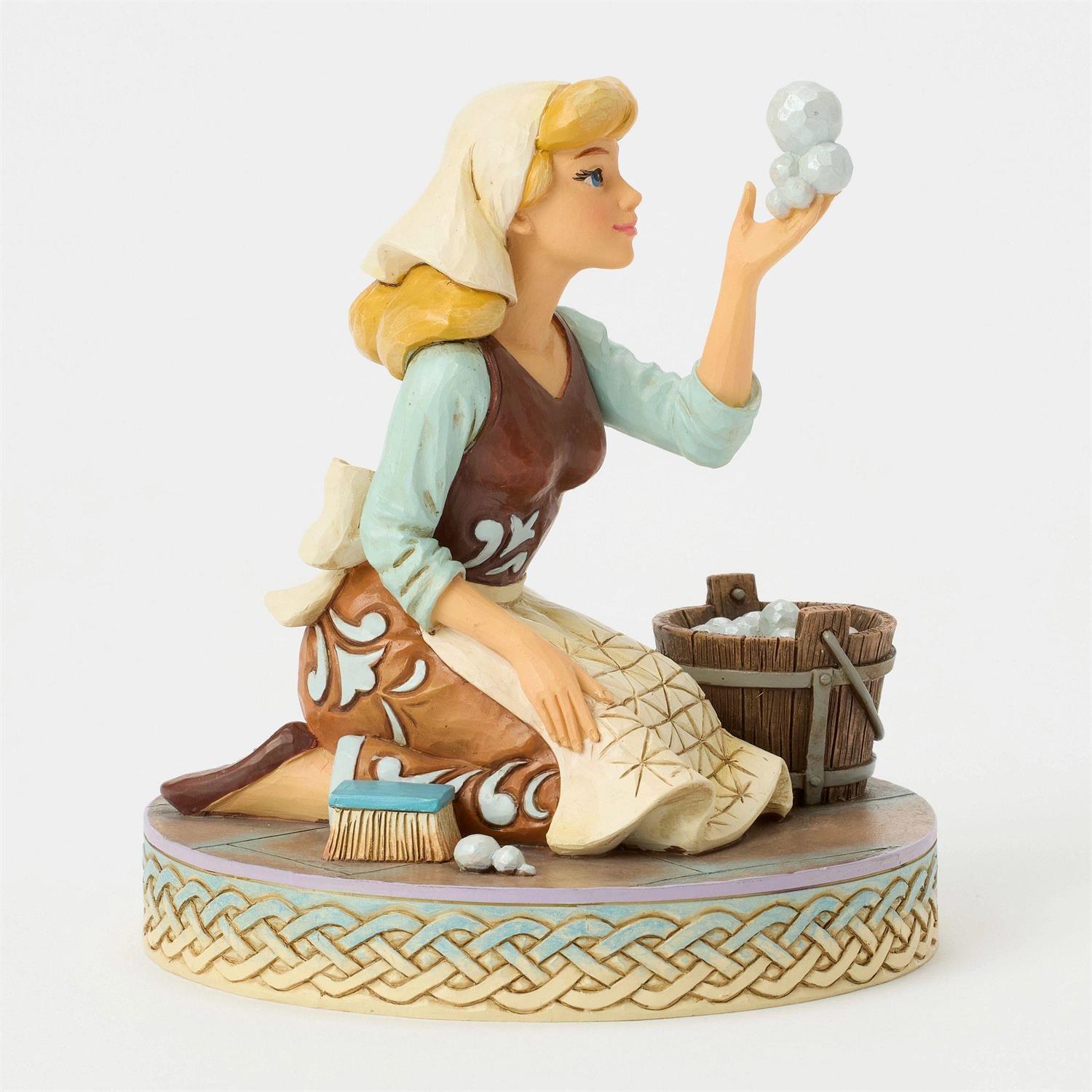 “Lo spirito di Cenerentola rimane intatto in questa toccante scena immaginata da Jim Shore. Vestita con il suo abito da cameriera, trova ancora gioia nei compiti più semplici, come catturare una bolla fluttuante mentre pulisce il pavimento. Gli incantevoli dettagli di Jim Shore esaltano la sua grazia, la sua gentilezza e la sua forza interiore. Queste statuette non sono giocattoli per bambini. Destinate solo agli adulti.”